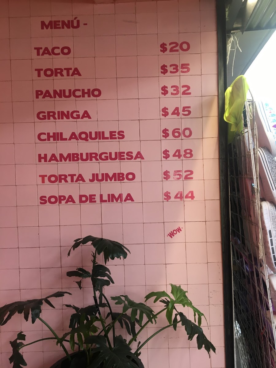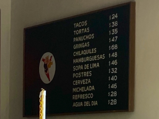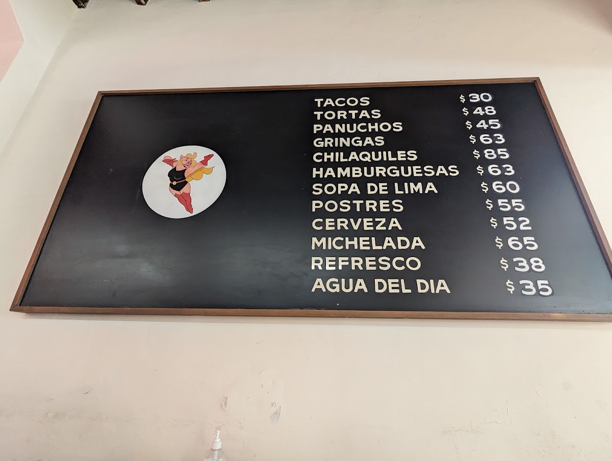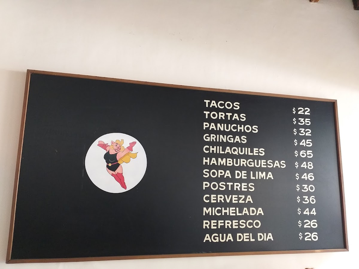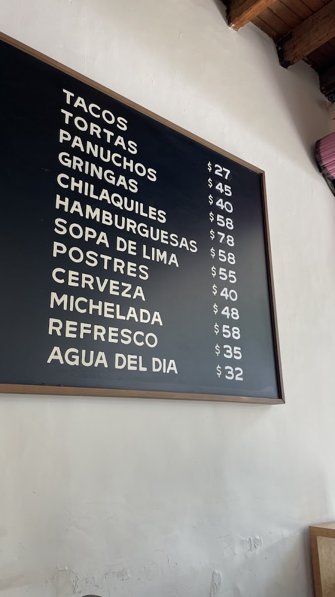 Main dishes include items such as hamburgers made with artisanal bolillo rolls alongside cochinita pibil, panuchos with refried beans and pickled onions, tortas filled with chilaquiles and cochinita pibil, and several taco variations. These dishes highlight the use of classic Mexican ingredients and regional flavors.