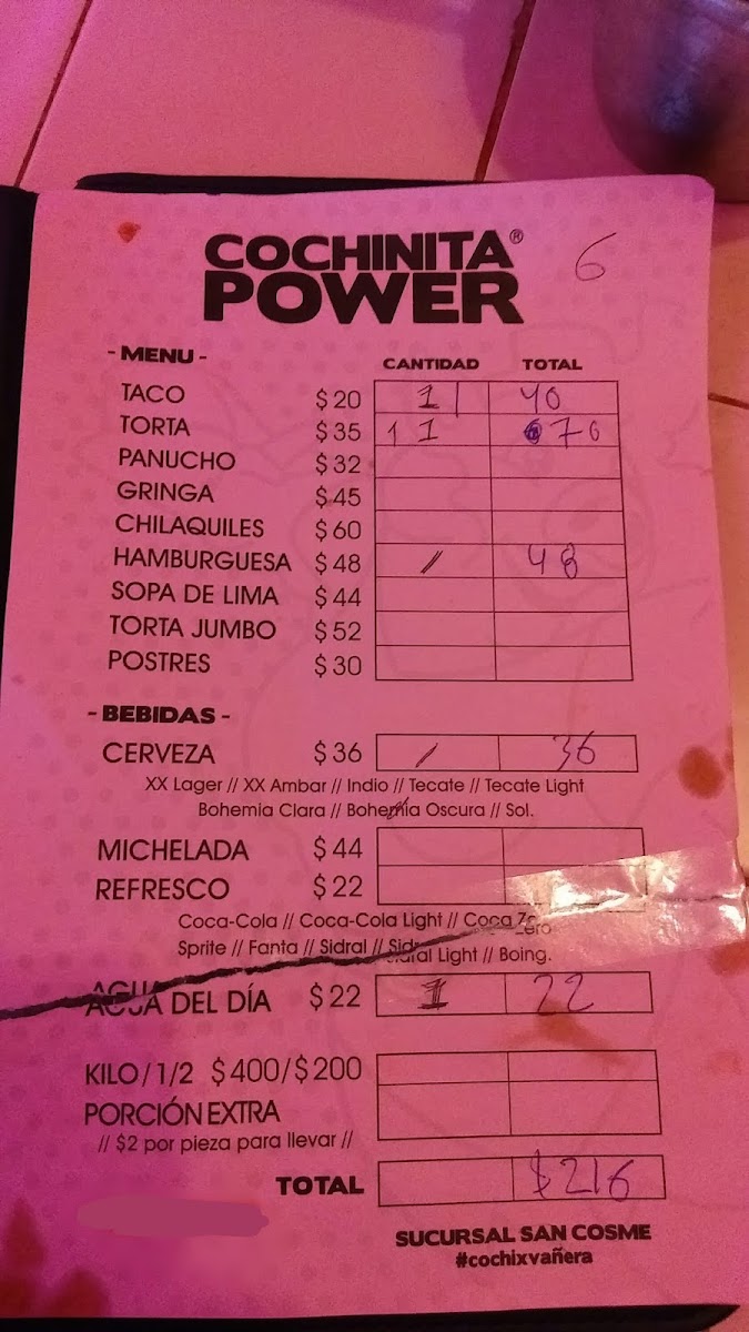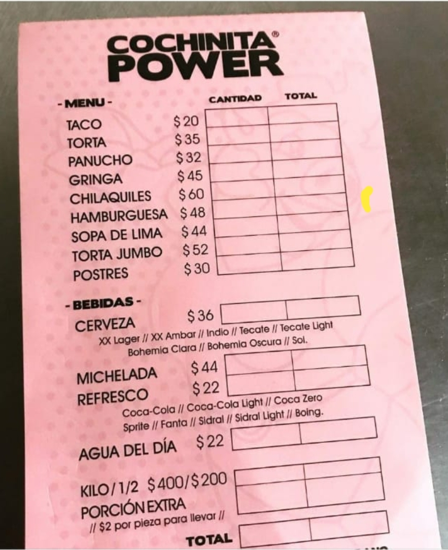 The menu at Cochinita Power features a variety of traditional Mexican dishes centered around cochinita pibil, a slow-roasted marinated pork. The food selection is organized into main dishes, desserts, and beverages, offering options for lunch or casual dining.